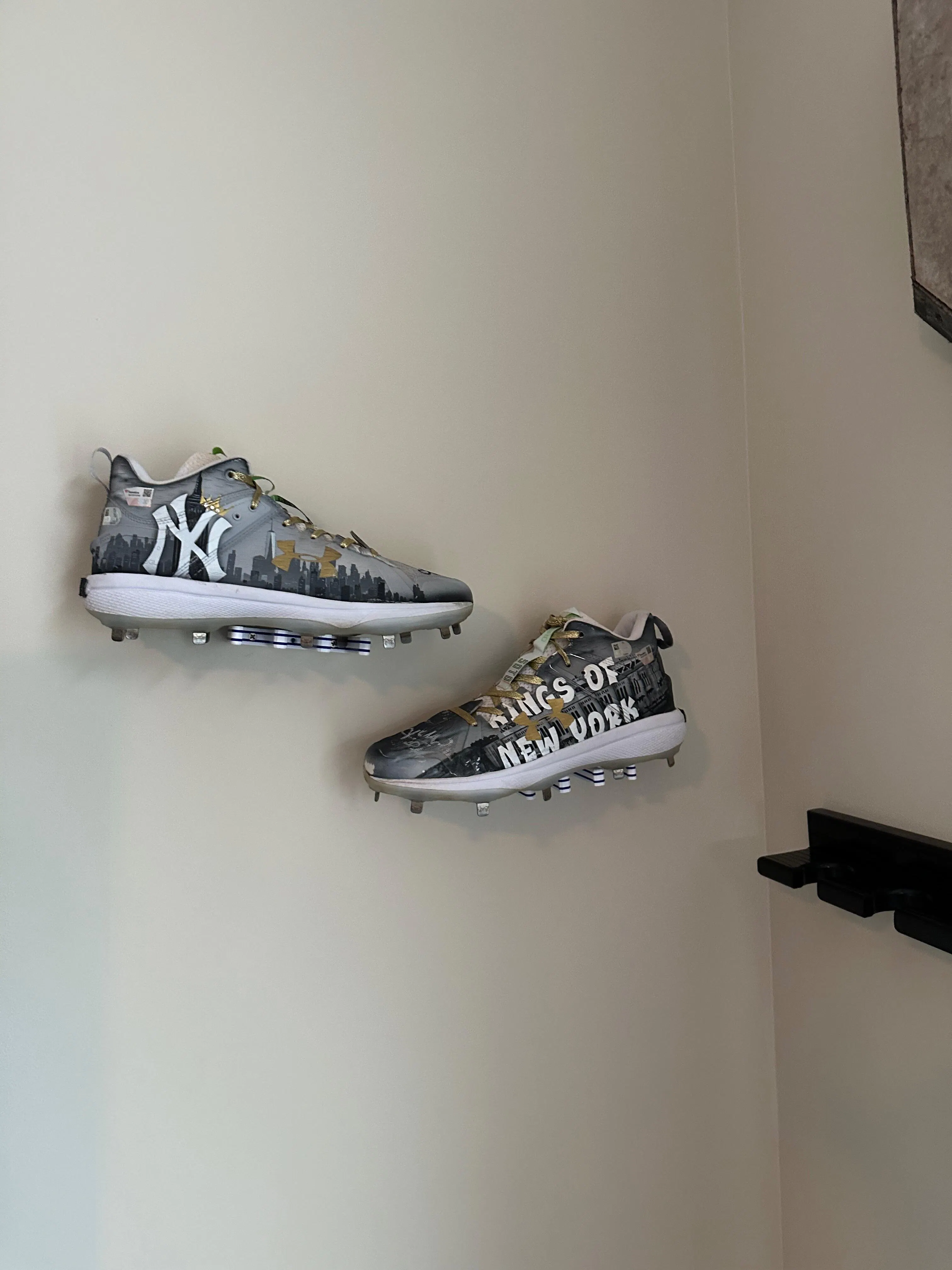 Mike Purchased a pair of Yankees game used cleats , and needed hangers that would make them pop. Searched hard, and couldn’t be happier with my stickemups. EZ to hang, and they look great. Got a call. Here in the USA, from the owner — a guy who cares and takes pride in his product. Nothing out there quite like em.. five stars!!!